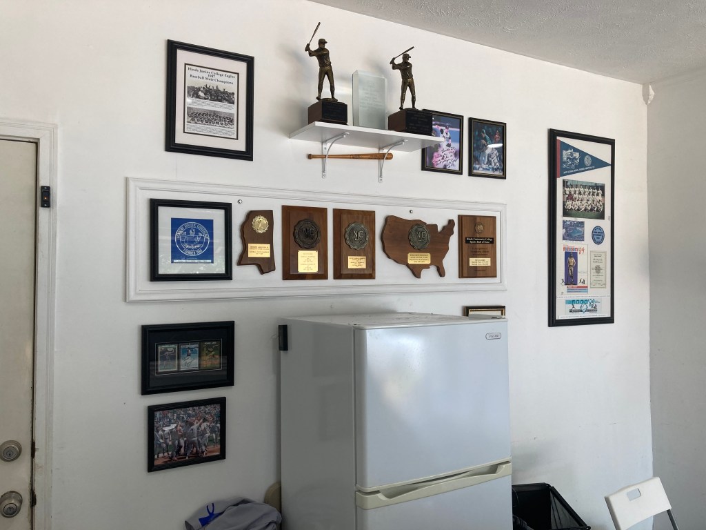 This ring was loaded with championships; state, region, district & a JUCO World Series1989 State ChampionshipChris Maloney, Joe Gibbon, Rick Clarke. Mississippi Sports Hall of Fame World Series Party.Coach Ferriss gave Josh a private showing in his museum.Famous bus breakdown in 1999. We arrived at the game against the #1 team in the country 15 minutes before game time; won 10-2.The Great Chad Bradford with the Rays.At our JUCO Showcase, former big leaguer, Roy Oswald from Holmes CC shows of his Olympic Gold Medal.Terry Gray’s famous bomb in the JUCO World Series in Grand Junction.Ricky Chisolm giving me instructions in a newspaper article about the RaidersOne of the best. Jeff Long, 1988.Rapp and Bradford were playing each other in Anaheim and autographed this ball for me.Pat Rapp’s World Series ring with the Marlins in 1997.My kids had this printed for me for a Christmas present. The idea of a blog and podcast came from this.The great Hill Denson.Arm patch for jacket.We consolidated all Magnolia Academy State Championships on one plaque.Pencil drawing of young Josh. (Jerry Smith, Artist)I’m awarding Coach Perry with a bag of moose poop at the 2nd Roast.Pat Rapp, 1994One of the first teams I coached in the Forest Hill Youth League. The Raiders.One of two home runs from Noah James in the State Tournament winner’s bracket game to send us to the championship.Rick and George game faces. We were winning by 10 runs. 🙂Hinds’ first Region 23 Championship, 1989The great Warren Guerriero finally received his bronze balls award, years later.Lee Toney hit in 25 home runs for Hinds in 1982. Still a team record. The staff. Warren Guerriiero, Pat Rapp, David Townsend, Chad BradfordChad Bradford and Josh at Chad’s Major League Debut for the White Sox in Arlington, Texas A hug for Josh when Hinds won the State Championship game in 2010.Josh joins the Eagles as pitching coach and recruiting coordinator.Quite a stash of collectables.This is what Josh did at every Hinds game for years.D.M. Howie inducted into the MAC Coaches Hall of Fame. Josh and Rick after winning the District E Championship over Chattahoochie Valley in 1994 making Hinds the first Mississippi team to play in the D2 World Series in Millington, TN.1987 reunion. Pat Rapp and Kelly Dickinson. Josh Clarke is on the left. Anthony Williams on the right. Dennis Dupin , Warren Guerriero, and Vic Puckett on the next row.Gift from Pat Rapp.Hinds Baseball Museum & Garage.Jeff McClaskey retirement.He signed this for me.Stan Cliburn, Lance Barksdale, Billy EarnhartChad BradfordPat RappMy grandsons Dean and Houston at their new home away from home at Hinds.Coach Perry gave me his plaque for safe keeping; 1974 State Championship.Young Josh training in style in our backyard.This page is updated often. Check back often.